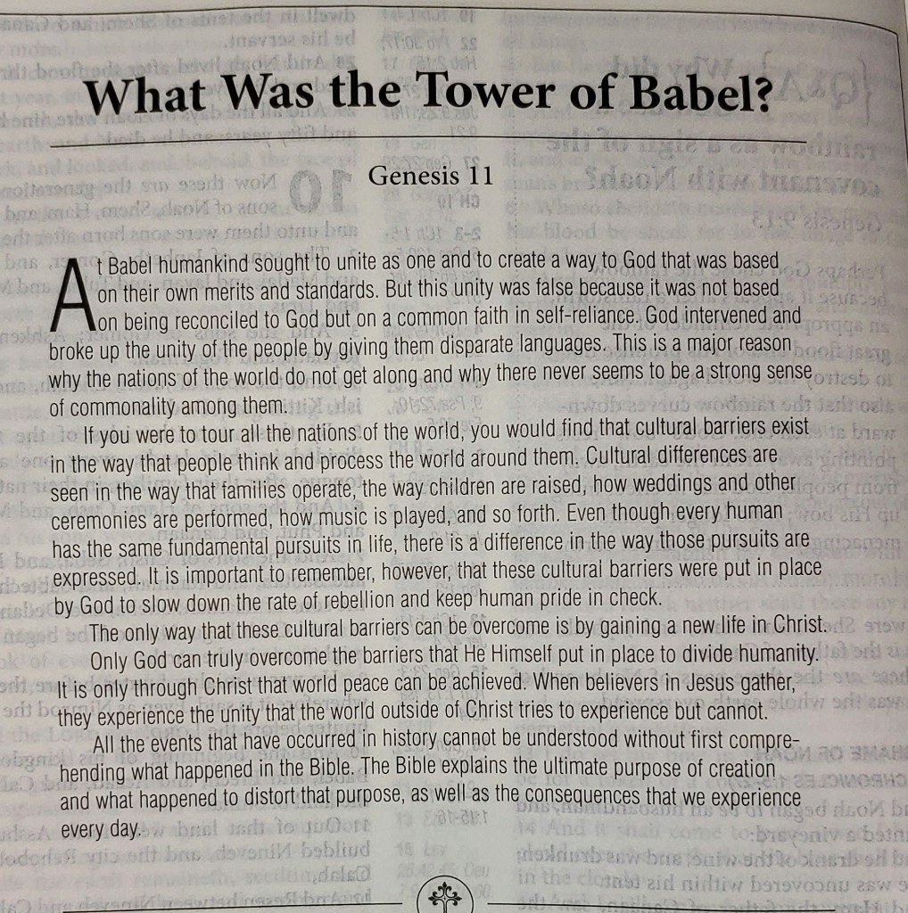 Mankind wanted to create a way to God as they saw fit without being reconciled to God and having faith in self-reliance. God confounded them and scattered them. Which is why we have different languages and cultures to this day.